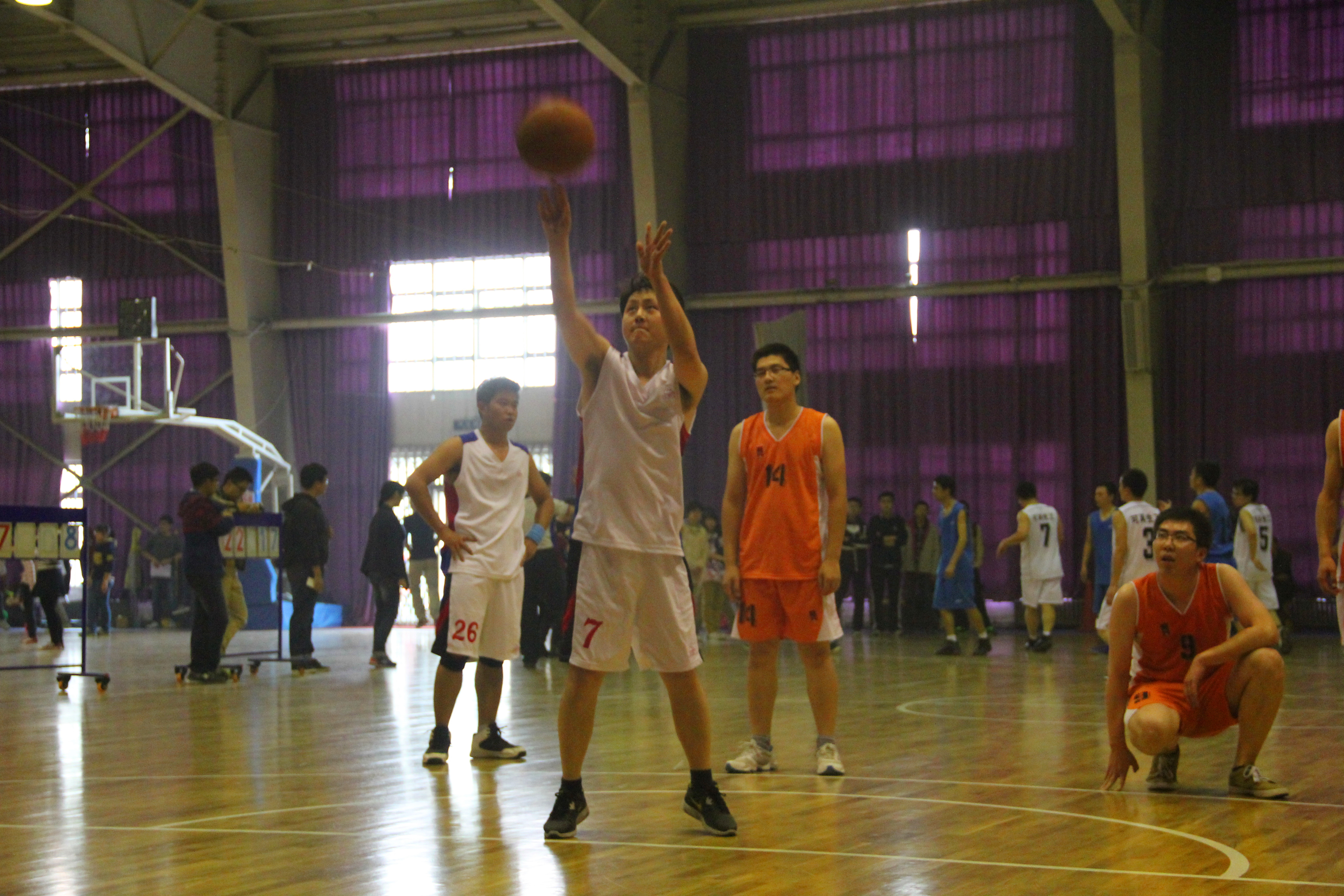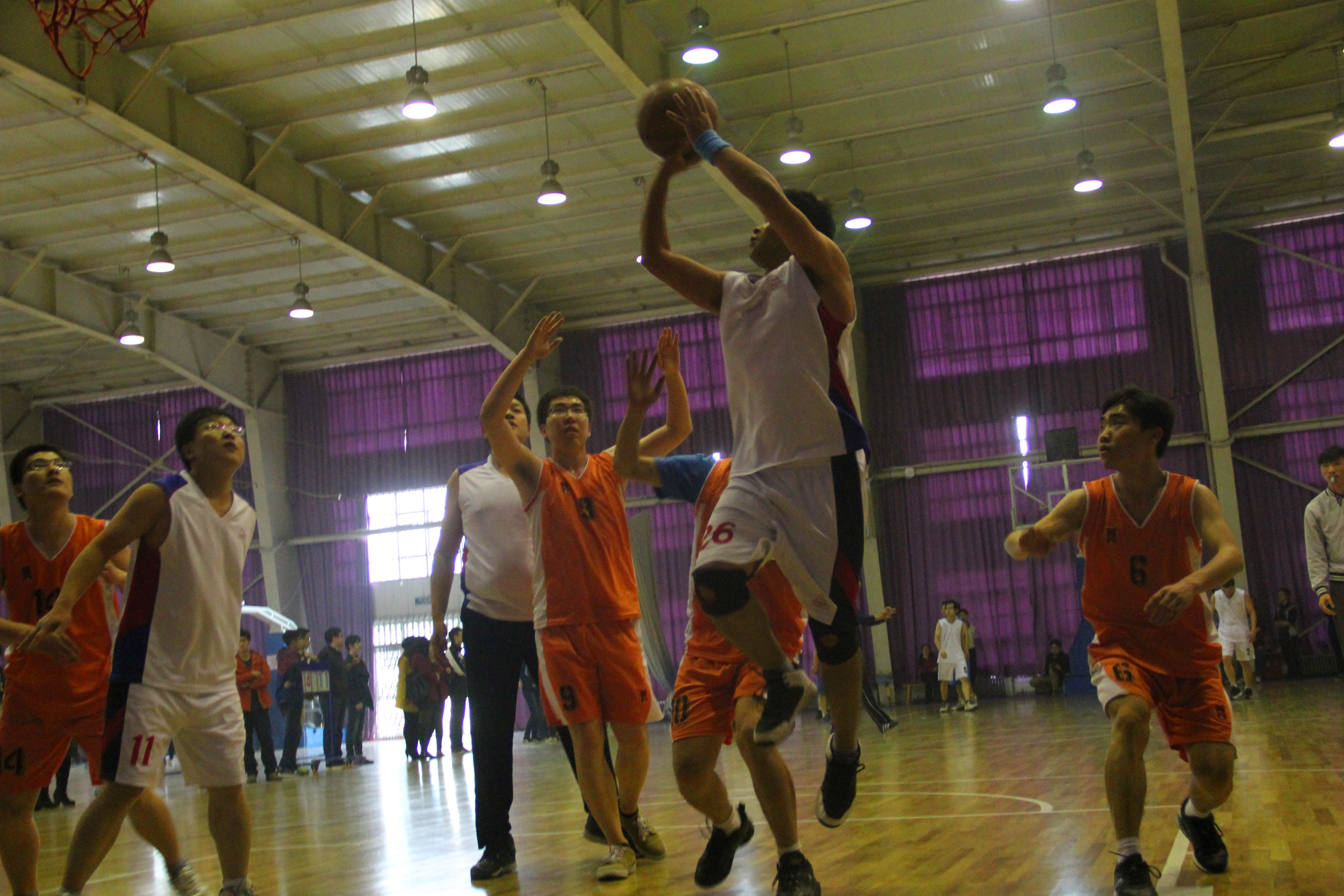 下半场伊始,图书馆加强进攻,试图扳回比分。但核院技高一筹,能里能外,内外结合,尤其在最后阶段,核学院以两记三分球点燃全场气氛,观众们欢呼雀跃,激动不已,呐喊声震耳欲聋,有的同学甚至还边跳边叫,场面异常激烈。