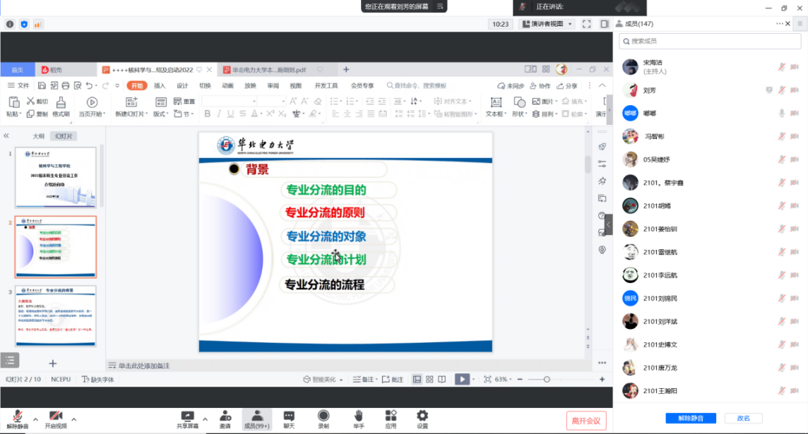 最后,刘芳对本次专业分流宣讲会进行总结和补充,并介绍了学校与莫斯科动力学院合作开展的国际交流项目、与中广核集团等开展的校企联合培养项目,鼓励同学们踔厉奋发、进取向上,在核能领域创新发展的赛道上,奔跑出华电人的好成绩。