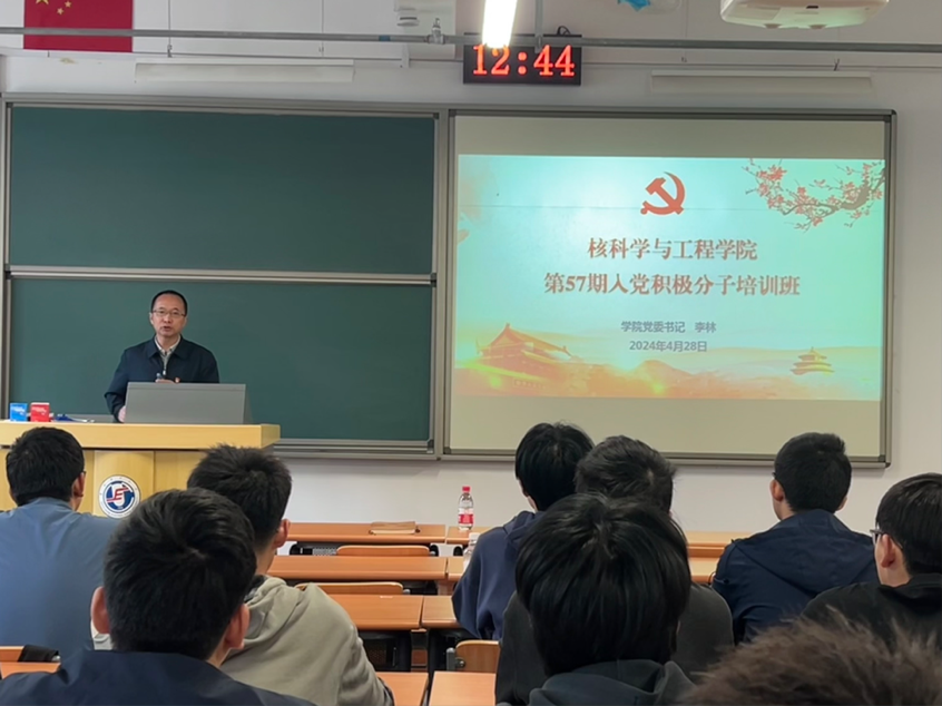 4月28日中午,jdb电子中国官方网站举办第57期入党积极分子培训班“书记讲党课”,学院党委书记李林为培训班全体学员讲授专题党课。培训活动由学院辅导员宫馨主持。