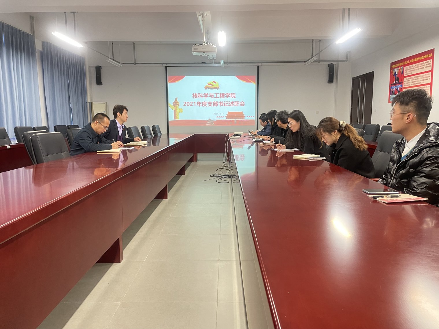 会上,7位学生党支部书记和3位教工党支部书记进行了现场述职。各支部书记通过总结2021年度履职情况,查找存在的主要问题并进行原因分析,对下一步工作提出改进举措。通过各党支部书记的述职报告,可以看出党支部书记们作为各个支部的标杆,都有着非常负责认真的工作态度。在交流学习中,我们发现,许多党支部能在有效开展党支部活动的基础上,还能进行工作创新,进而取得一些党建工作成果。其中,辐射防护与环境工程教研室党支部成功申报“全国党建工作样板支部”,本科生党支部获“校级优秀特色活动示范党支部”、红色“1+1”示范活动三等奖。