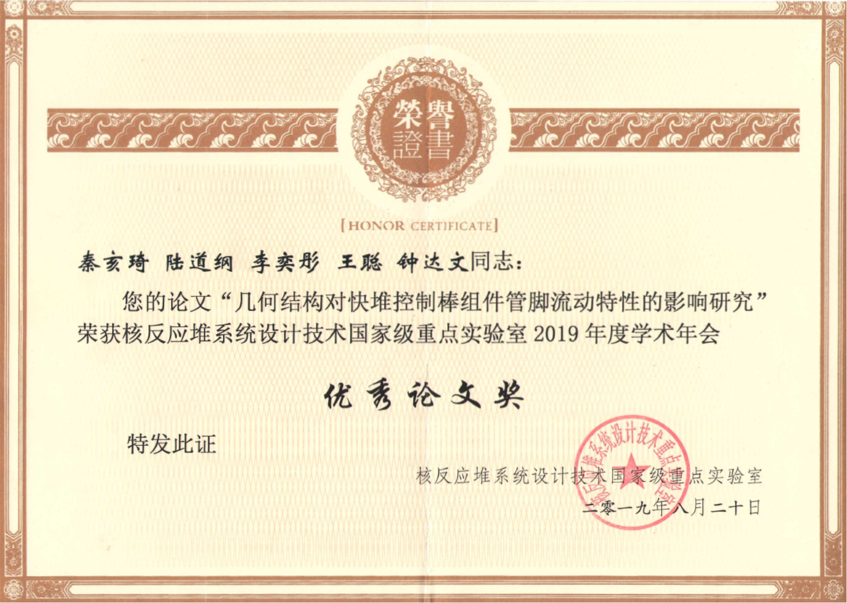 与会人员针对反应堆物理、核反应堆安全、结构力学及系统、仪控、热工水力等领域进行了深入讨论与交流。此行陆道纲教授团队共投稿4篇,包含反应堆热工水力、结构抗震等方向,在分会场报告中受到业内同行的广泛认可。最后在优秀论文评选中,秦亥琦同学等人的题为《几何结构对快堆控制棒组件管脚流动特性的影响研究》的论文荣获“优秀论文奖”。