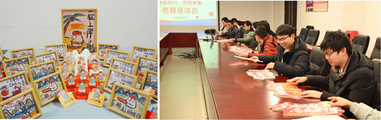 学院向考研学生发放了定制考研礼物,百余份设计简洁的祝福摆台,学弟学妹为每一份礼物亲手书写了专属祝福贺卡。体现了学院良好的学习氛围与温暖的传承文化,饱含了学院对同学们在考研战场上旗开得胜、收获满满的殷切期盼。